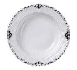 Inspirert av den kjente Halvblonde-kolleksjonen fra 1888 har Royal Copenhagen nå kommet med Sort Riflet Blonde! I likhet med klassikeren Prinsesse har Sort Riflet Blonde en håndmalt, dekorert blondekant mens resten av overflaten er blank. Et elegant servise som vil holde seg like populært i generasjoner. Bruk gjerne deler fra Prinsesse sitt brede utvalg sammen med denne nydelige, sorte utgaven. Denne dype tallerkenen er 21 cm.
