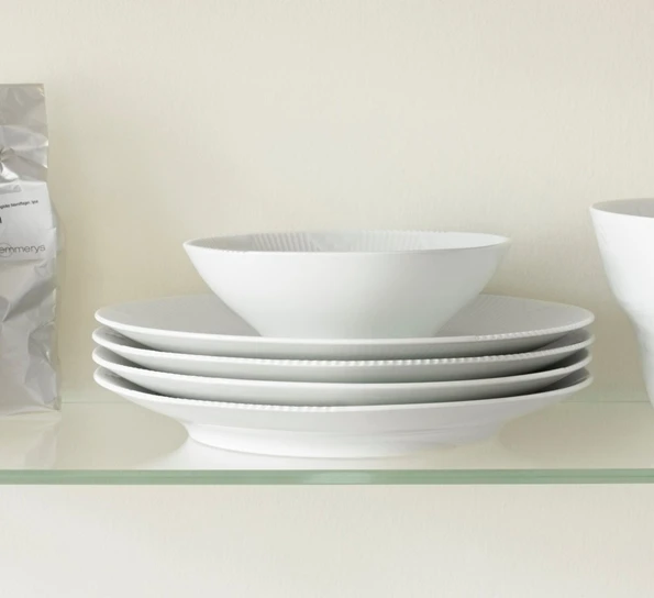 White Elements er formgitt av Louise Campbell og samler flere elementer fra kjente Royal Copenhagen-serviser i ett tidløst men moderne design. Denne tallerkenen er 22 cm i diameter og den rene, hvite fargen trekker oppmerksomheten mot relieffene og formene, som hver stammer fra ulike andre serviser som Flora Danica og Musselmalt Riflet. Det ligger solid håndverk og kjærlighet i hver eneste del. Det finnes et bredt utvalg deler i serien, både middagsservise og kaffeservise.